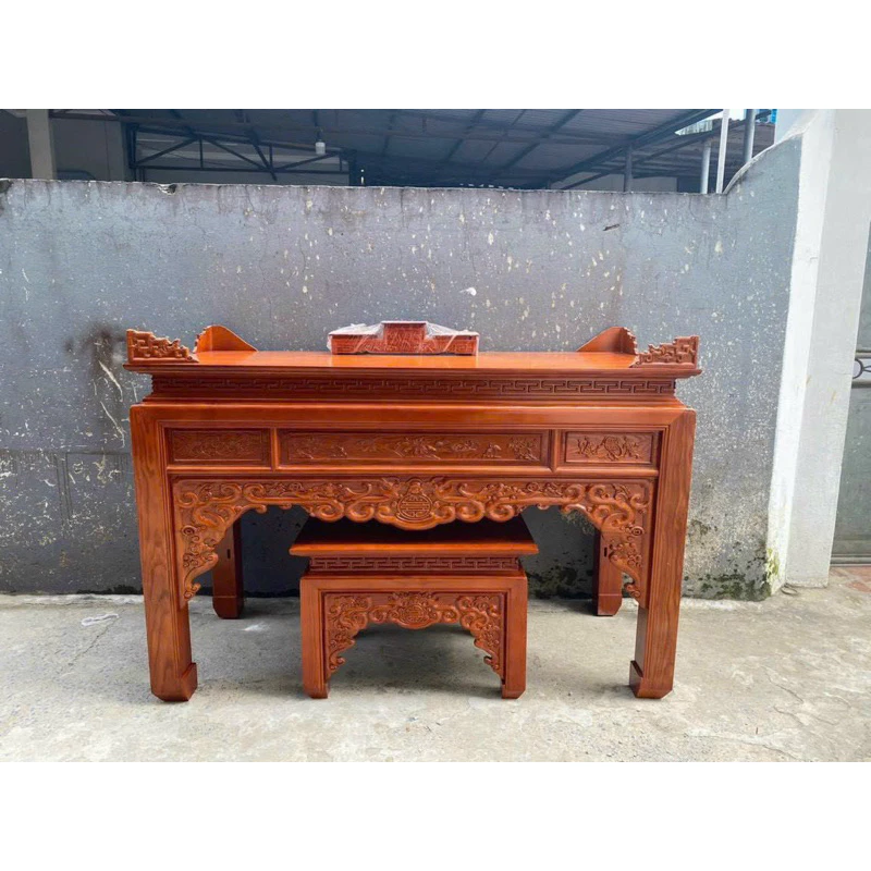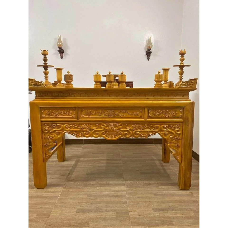 Sản phẩm án gian thờ gỗ mít là một trong những mẫu bàn thờ truyền thống được ưa chuộng nhất, nổi bật với thiết kế bề thế, trang trọng và những đường nét chạm khắc tinh xảo. Án gian thờ thường có bốn chân trụ vững chãi, tượng trưng cho sự ổn định và bền vững, phần yếm và dạ bàn thờ được các nghệ nhân tài hoa chạm trổ những hoa văn mang đậm dấu ấn văn hóa Việt như Tứ Linh (Long, Lân, Quy, Phụng) hay Tứ Quý (Tùng, Cúc, Trúc, Mai), mang lại vẻ đẹp uy nghi và linh thiêng.